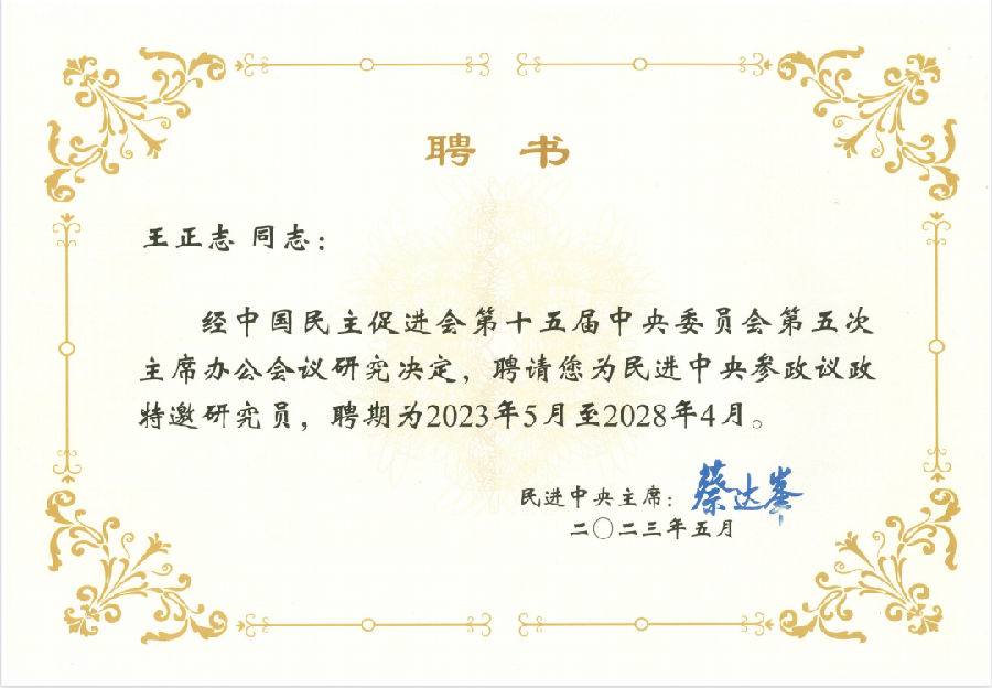 高文律师事务所王正志主任受聘为民进中央参政议政特邀研究员