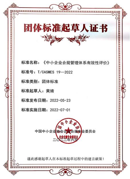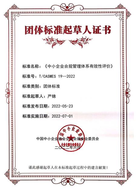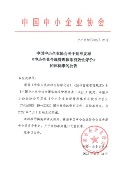 由中国中小企业协会企业合规专业委员会牵头起草的《中小企业合规管理体系有效性评价》(T/CASMES 19—2022)团体标准(以下简称“《标准》”)自2022年7月1日起正式实施。
