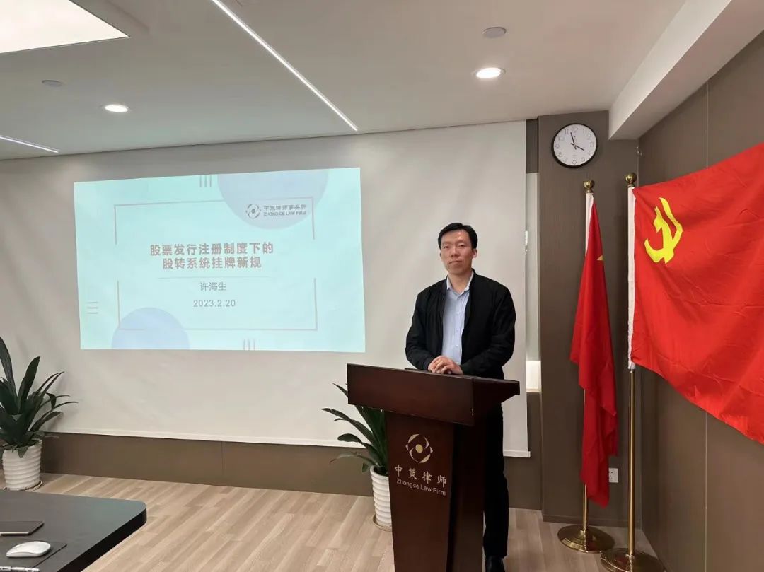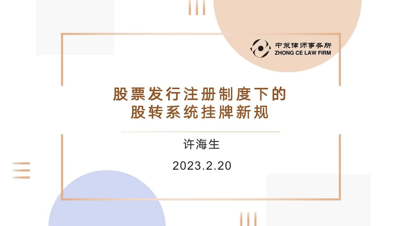 2023年2月20日,本所举办【第168期】例会学习讲座。本期讲座的主讲嘉宾是本所律师许海生,讲座主题为《股票发行注册制度下的股转系统挂牌新规》。