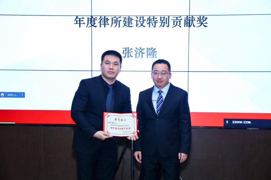 许海生律师、纪思戎获得年度最佳新人奖;孙倩律师获得年度进步最快奖;王艺雄律师获得年度活动组织奖;朱珍珍律师获得年度专业研究奖;李曦冉律师获得年度优秀共产党员奖;焦梁律师获得年度最佳讲师奖;赵伯洋律师、于佳琪律师、祝琳曦律师、刚玥获得年度优秀员工奖;张济隆律师获得年度律所建设特别贡献奖。